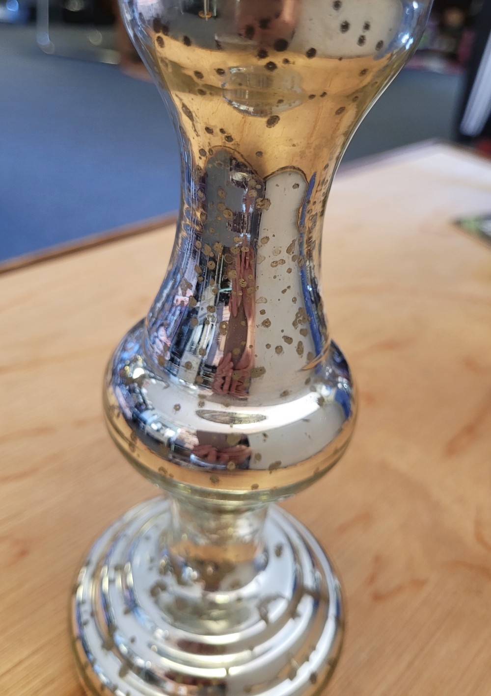 Mercury glass pilar candle holder. Approximately 8.5 inches tall by 3 inches across. Very good used condition, no visible damage.