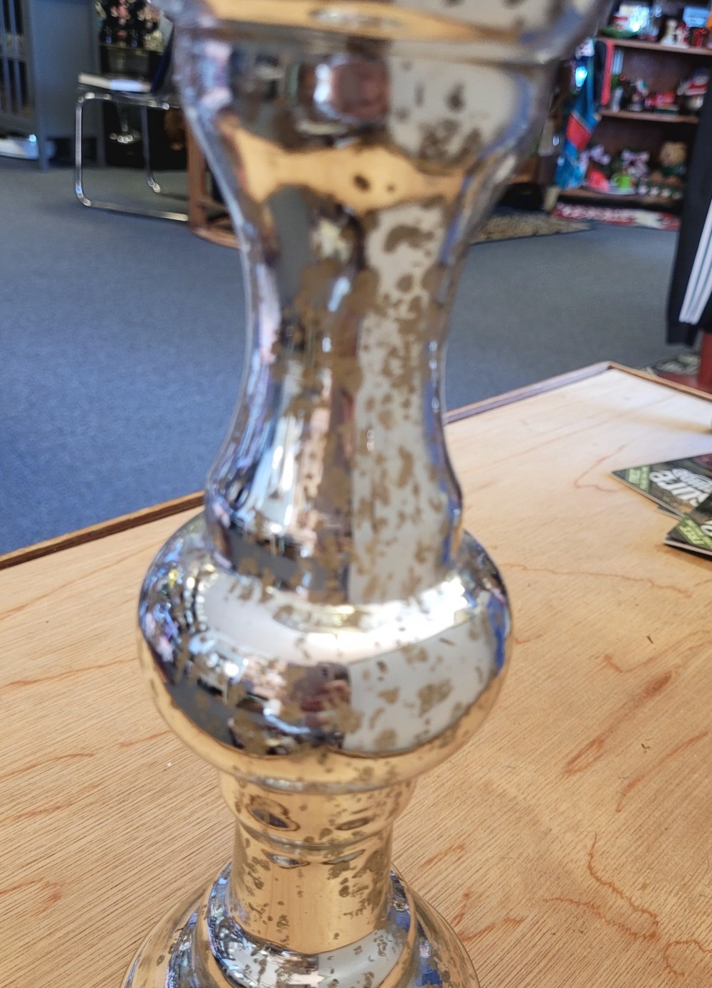 Mercury glass Pilar candle holder. Approximately 11.25 inches tall and 3 inches wide. Excellent used condition. No damage.