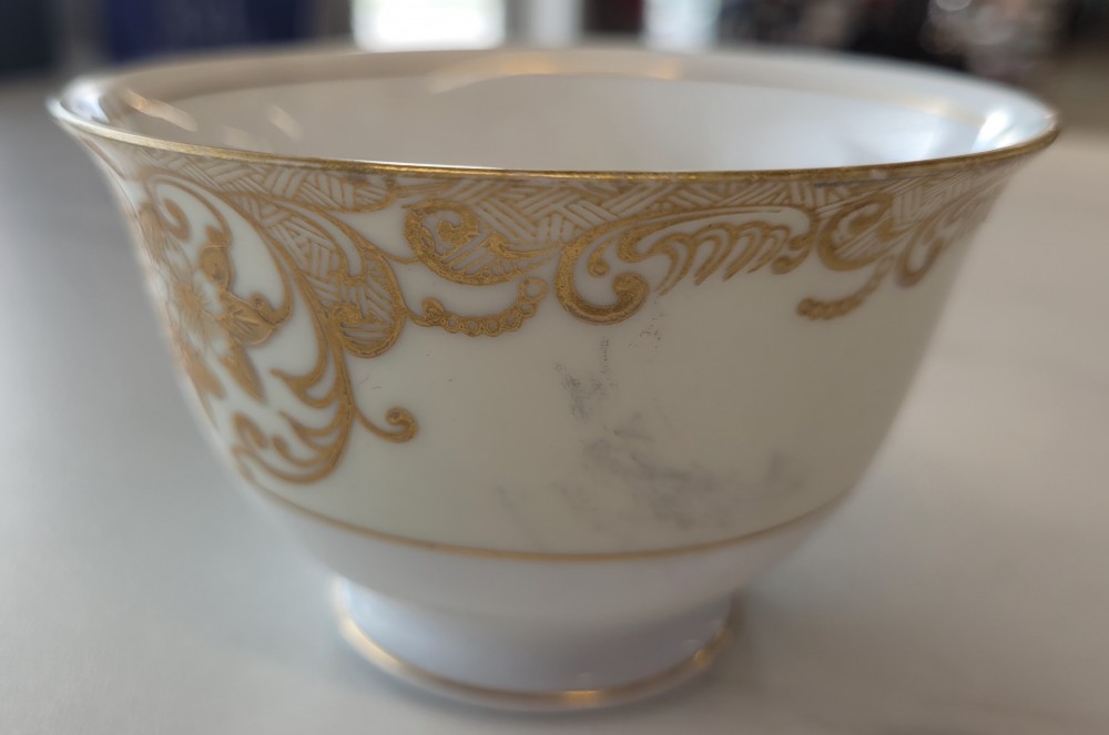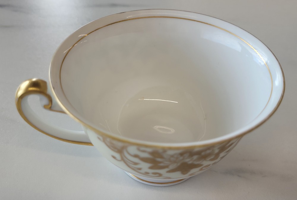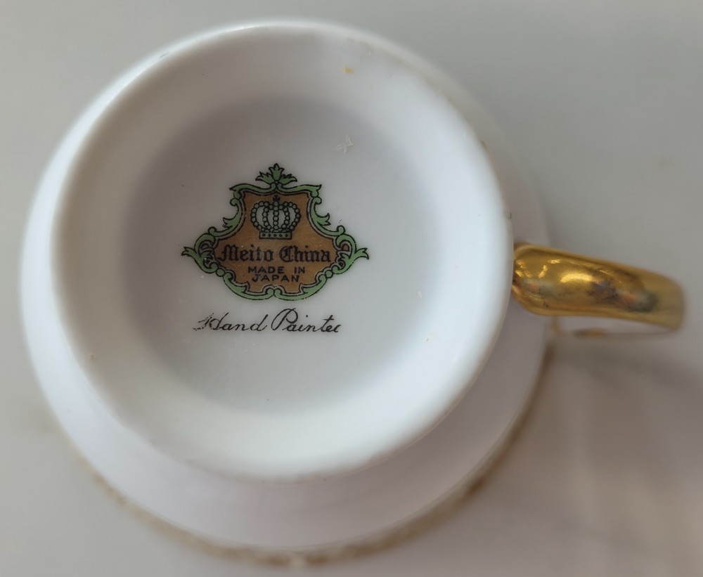 1930s "Art Deco" design by Meito China, made in Japan. Cream colored enamel on white China with hand painted gold design and trim. Cup structure sound, paint in good condition, trim shows wear appropriate for age. Slight dark discoloration on cup exterior.
