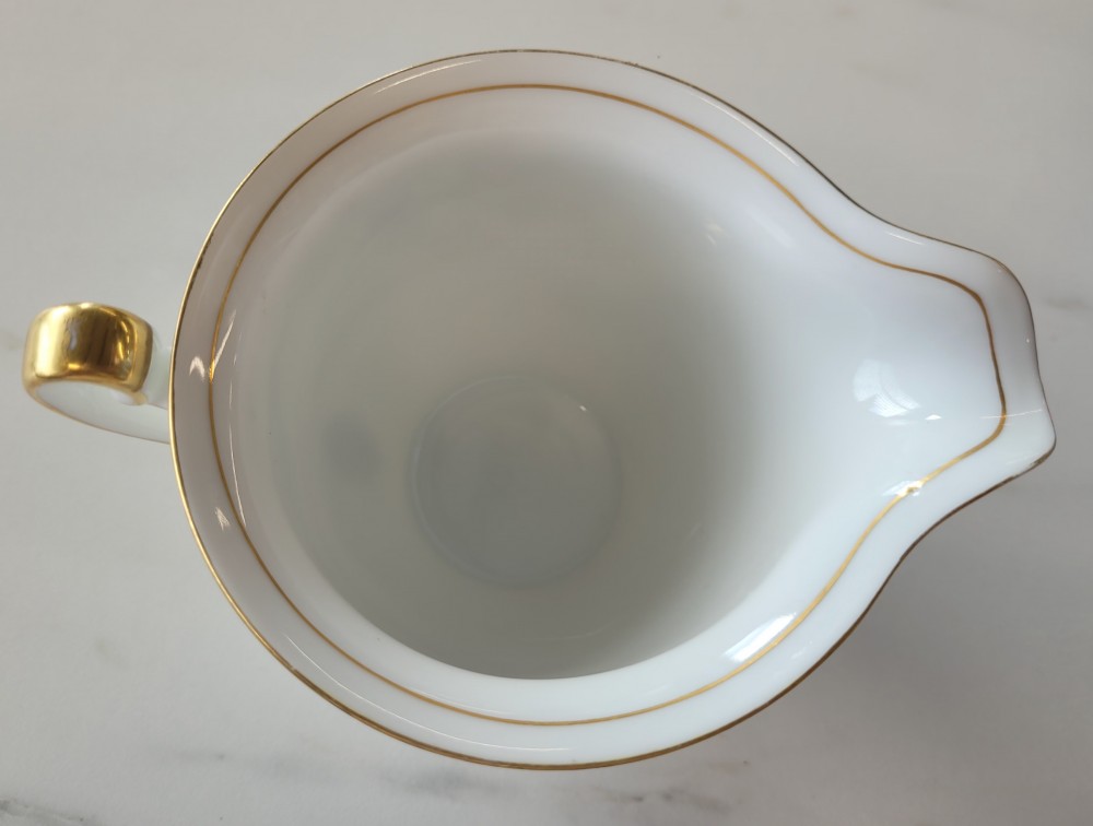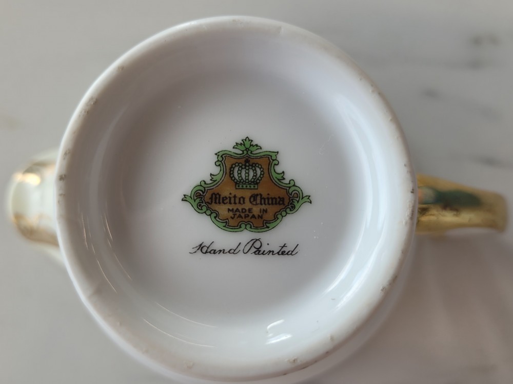 1930s creamer by Meito China, made in Japan. "Art Deco" hand-painted gold pattern on cream over white China. Structurally, creamer is in excellent vintage condition with no chips, no cracks, and no visible crazing. Paint is in very good condition for age, with slight discoloration near hand-painting and may be an imperfection from hand-painting. Gold design and trim is in very good condition, with minor wear on handle, but otherwise sound.