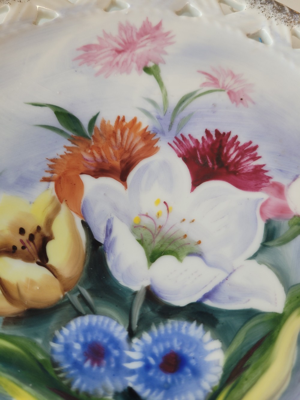 Vintage 1940s Ucago decor plate, Occupied Japan. Design features Asters, lotus, tulips, and roses in blue, violet, pink, red, orange, yellow, and green. Measures 8.25 inches. Unsigned.