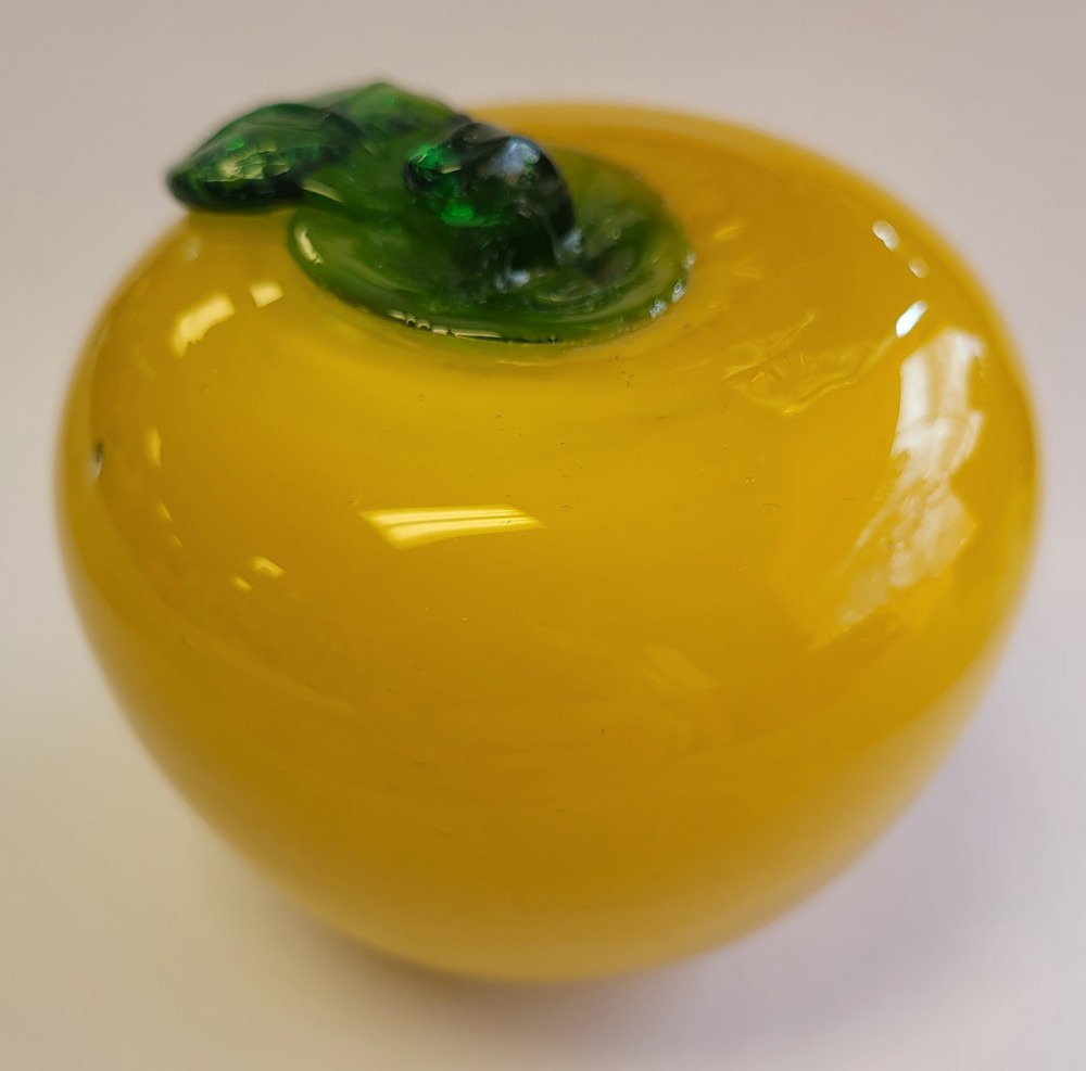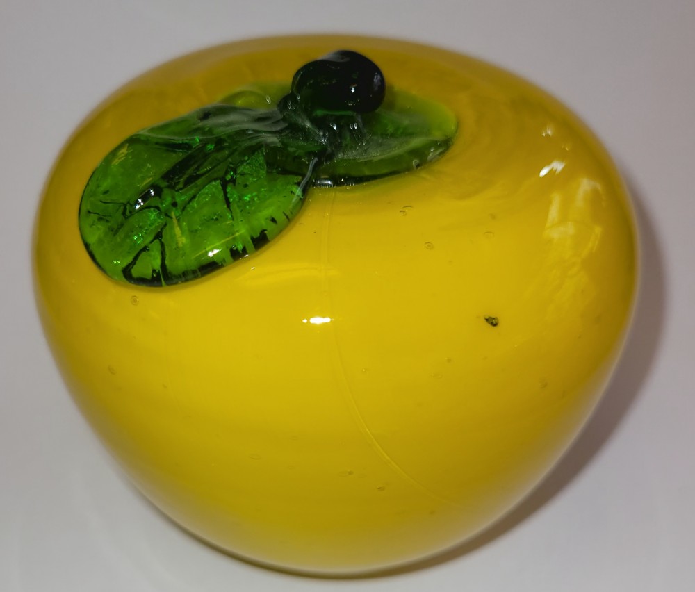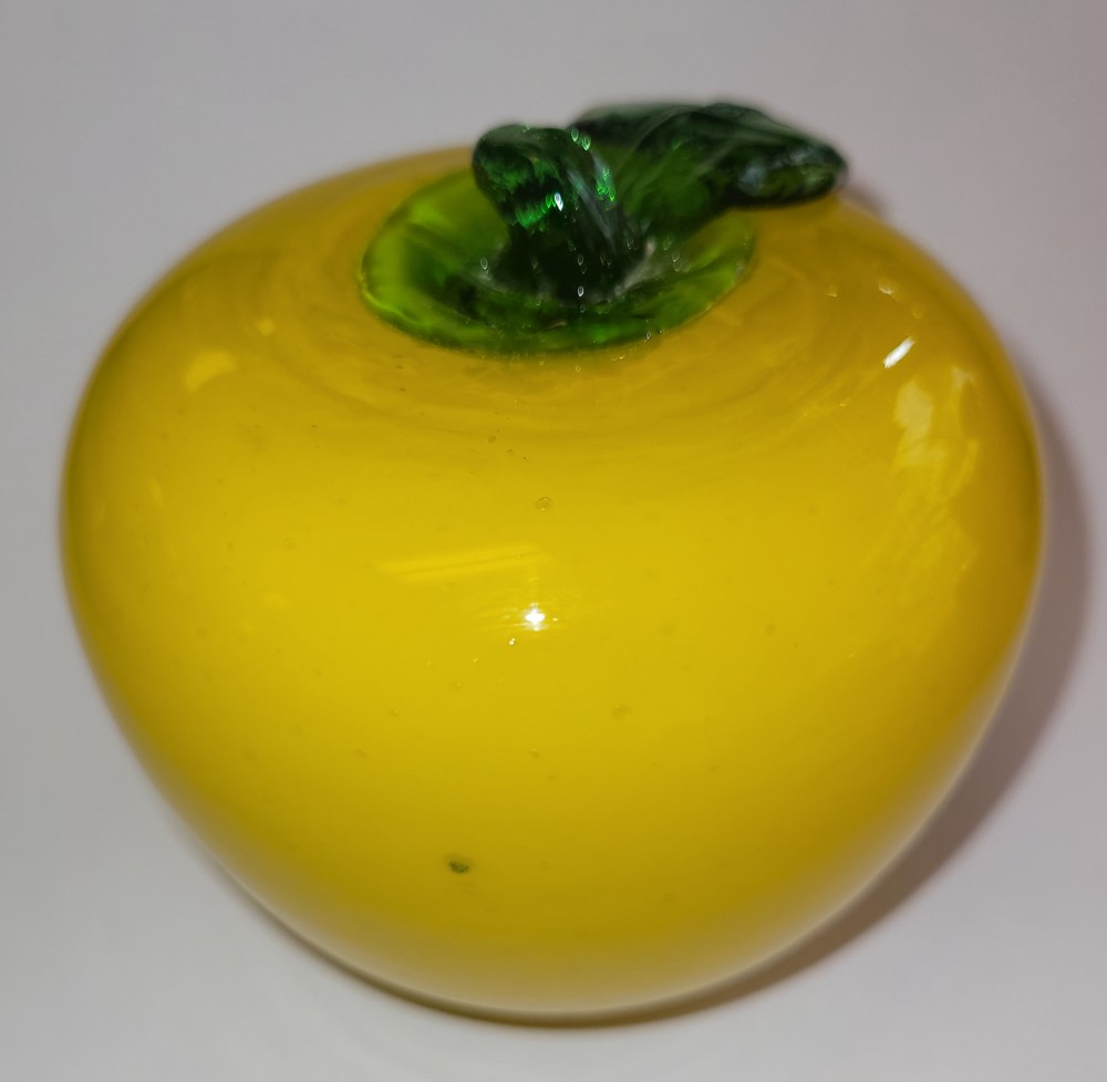 Vintage Murano style hand blown glass yellow/green apple. No chips, cracks, or damage. Two small flecks of green visible within glass (likely from hand-blowing procedures). Slight color variations and bubbles are present. Approximately 3 x 3.5 inches.