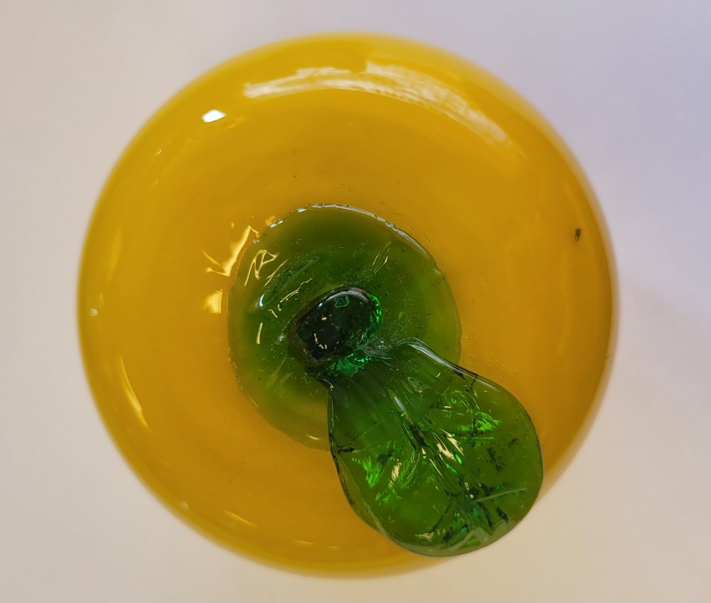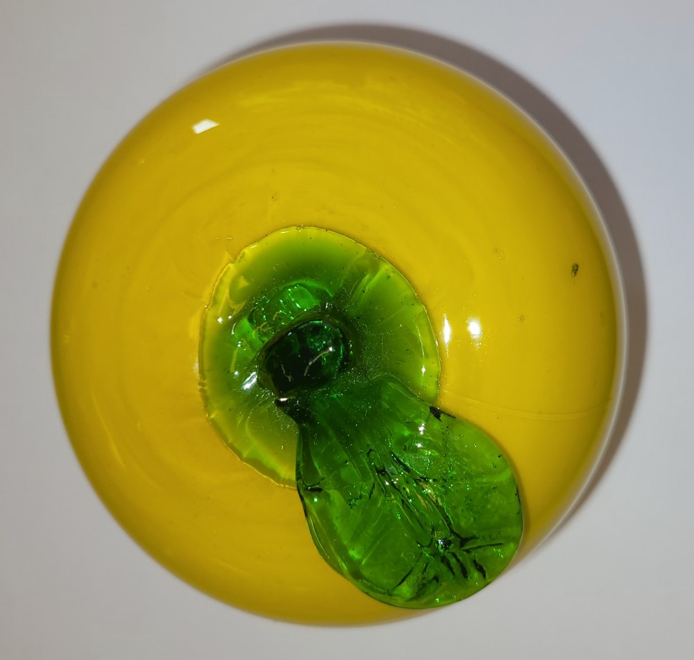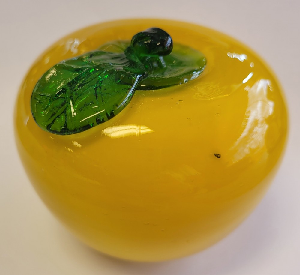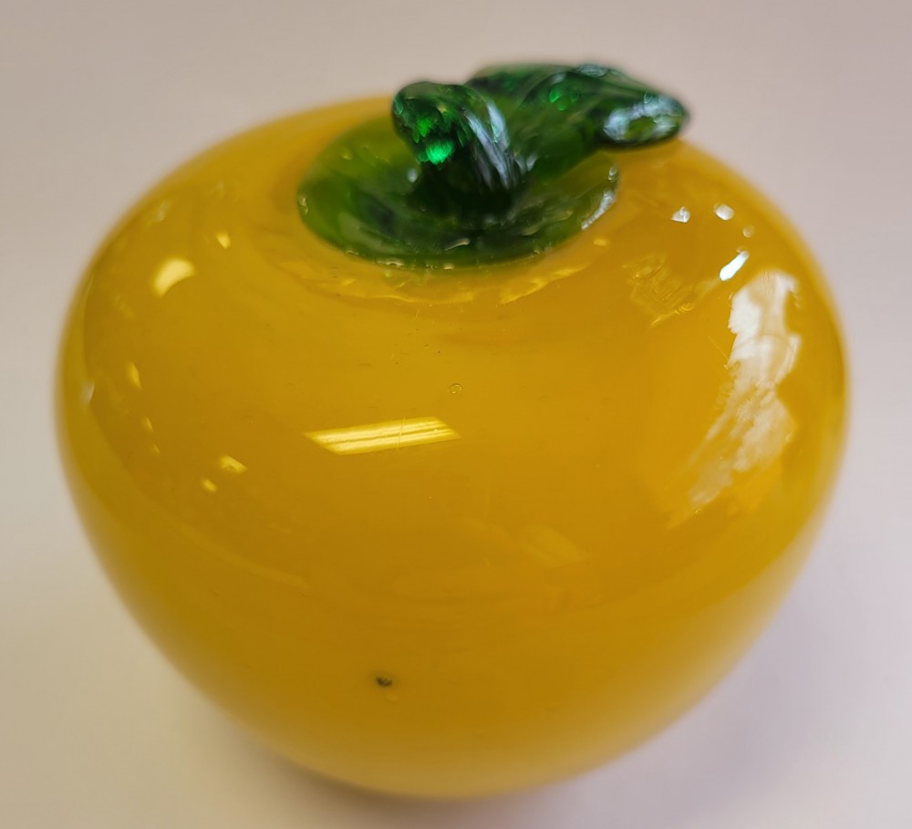 Vintage Murano style hand blown glass yellow/green apple. No chips, cracks, or damage. Two small flecks of green visible within glass (likely from hand-blowing procedures). Slight color variations and bubbles are present. Approximately 3 x 3.5 inches.