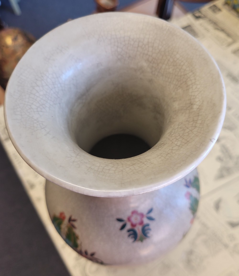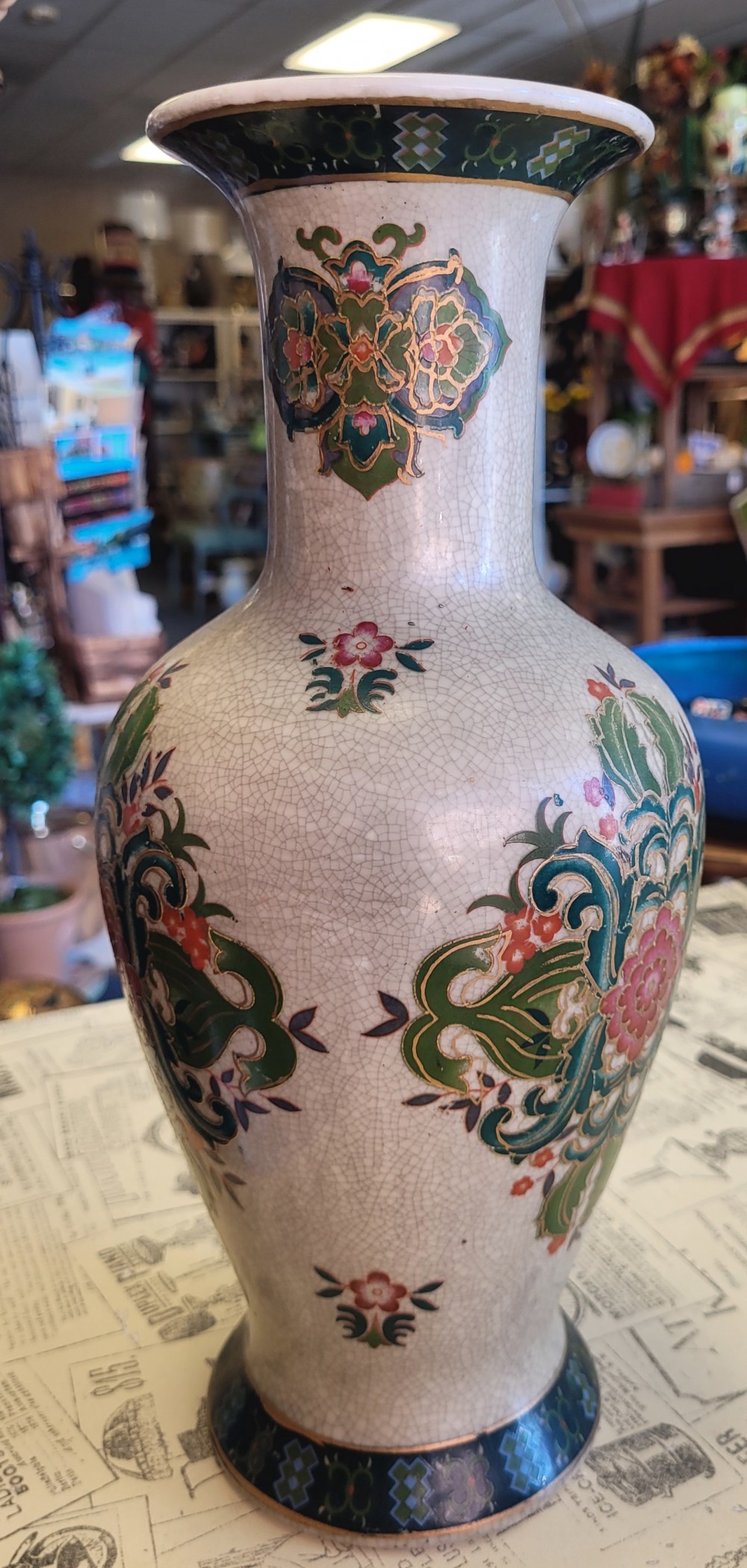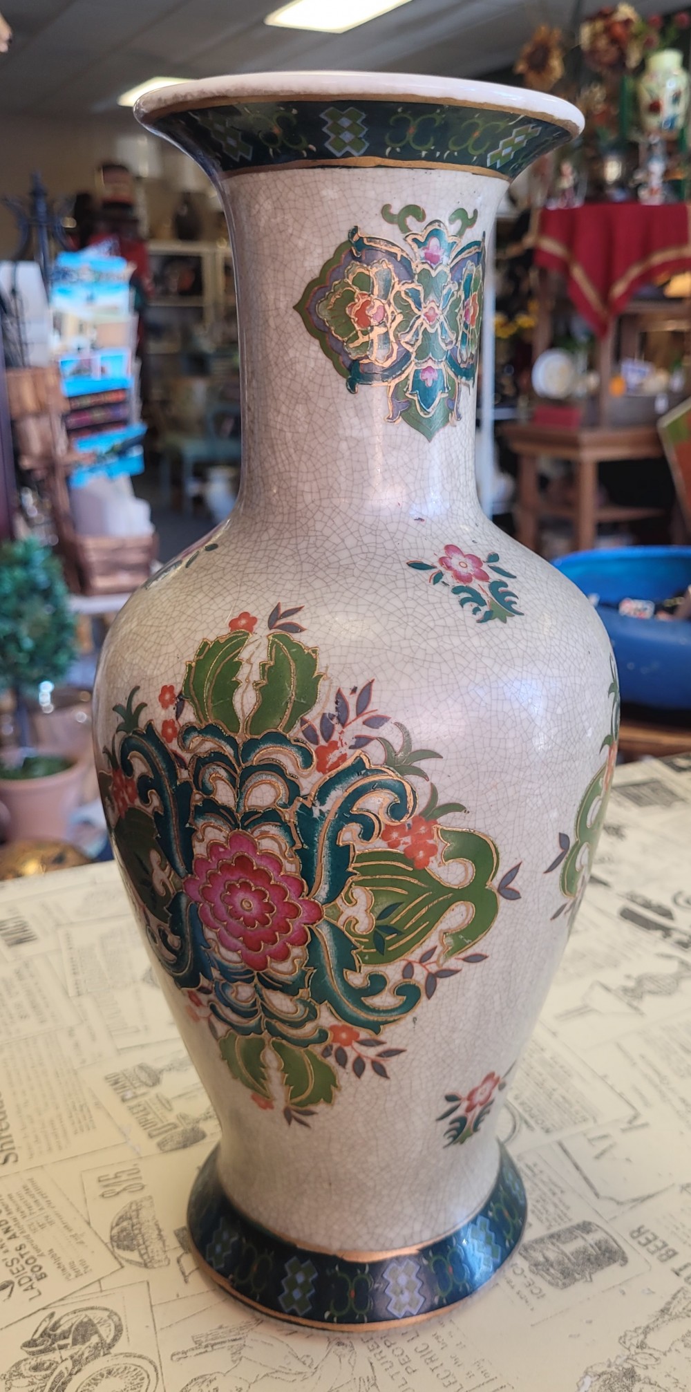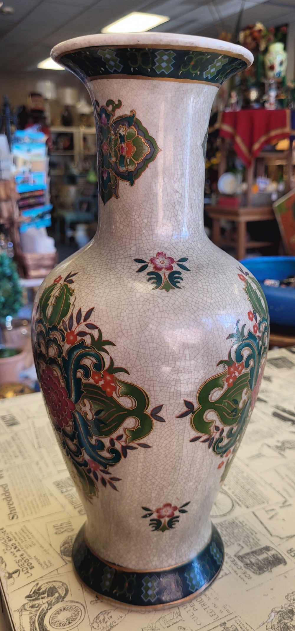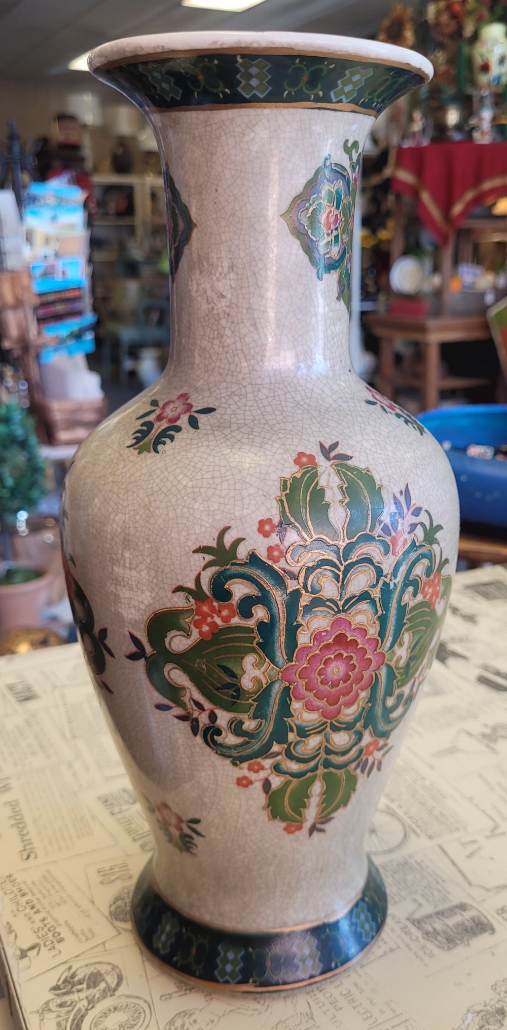 Vintage 12 inch Chinese vase. Excellent vintage condition. Features crackle finish with grey-beige background, greens, turquoise, coral, red, pink, grey, and gold. Hand-painted imperfections present. Structurally sound.