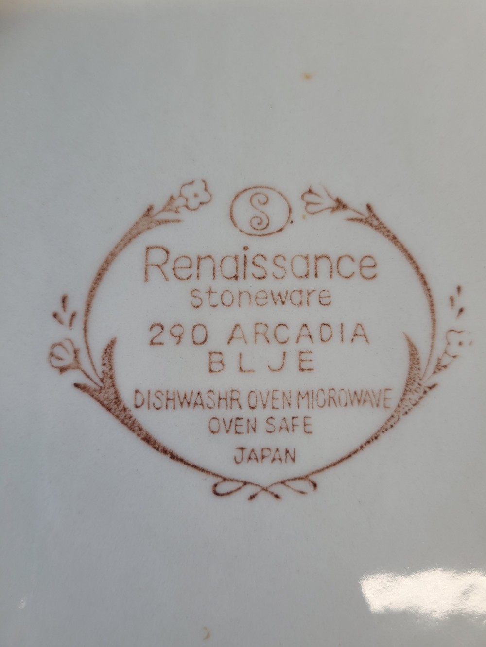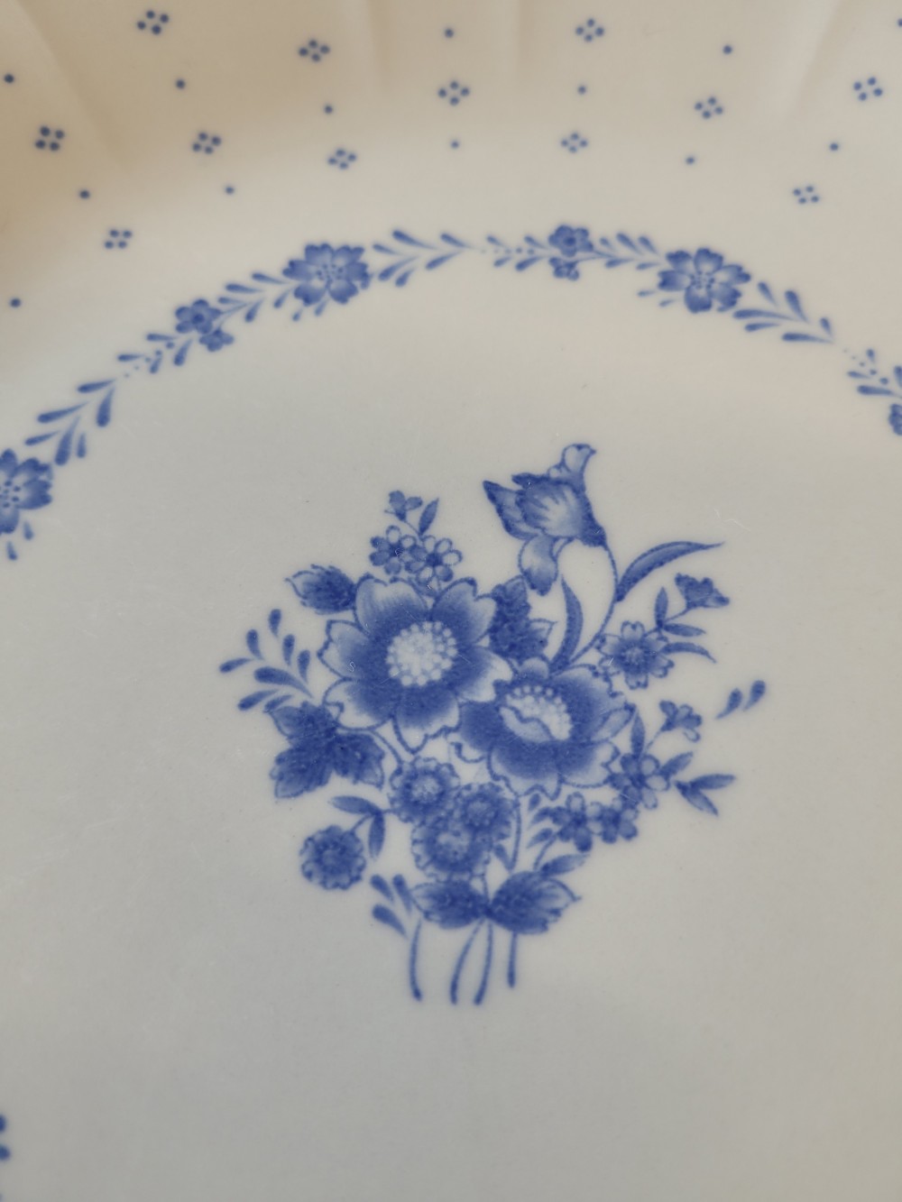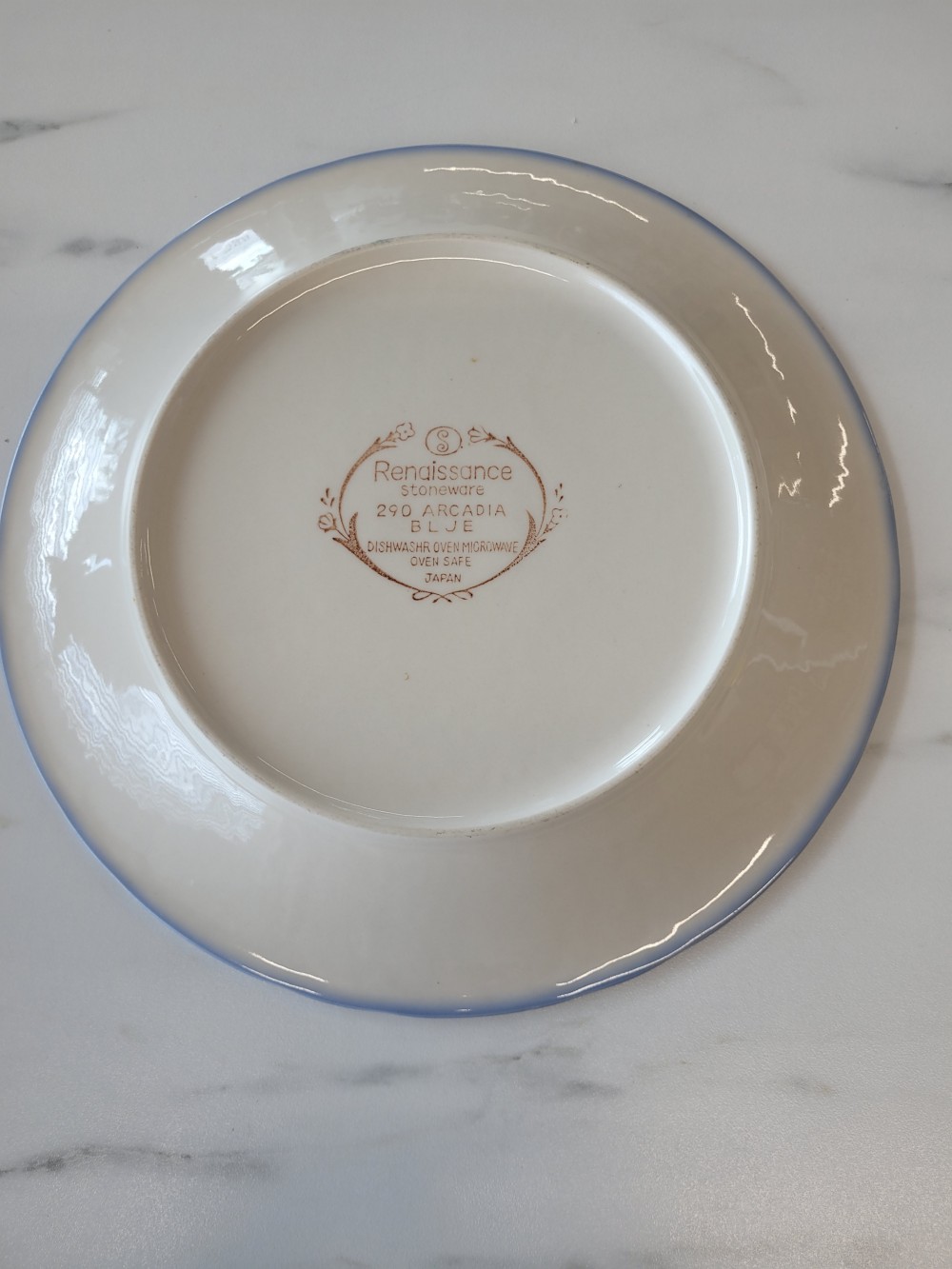 10.5 inch dinner plate by Sango Renaissance, Japan. Vintage 1985 design in Arcadia Blue, featuring a floral design with dots and blue rim. No structural damage, chips, cracks, or crazing. Stamped safe for dishwasher and microwave.