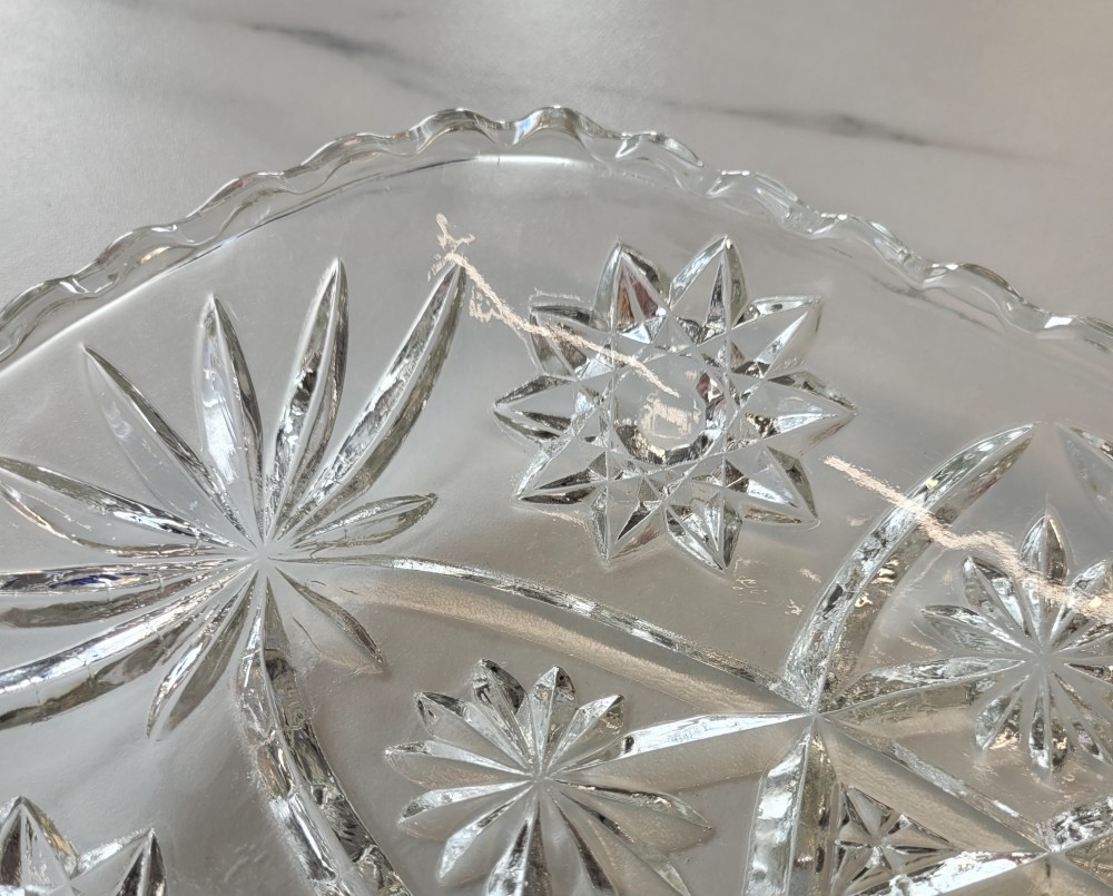 Clear Early American Prescut Glass (aka Star of David) relish tray by Anchor Hocking. Approximately 12x6.25 inches, raised sides. Excellent used condition.