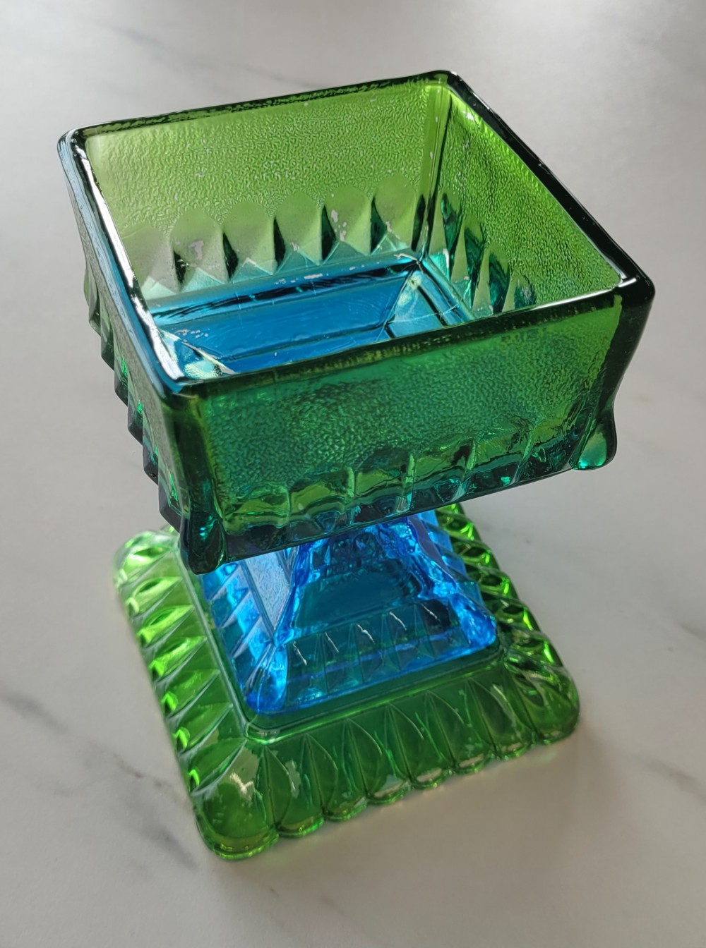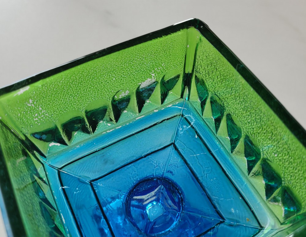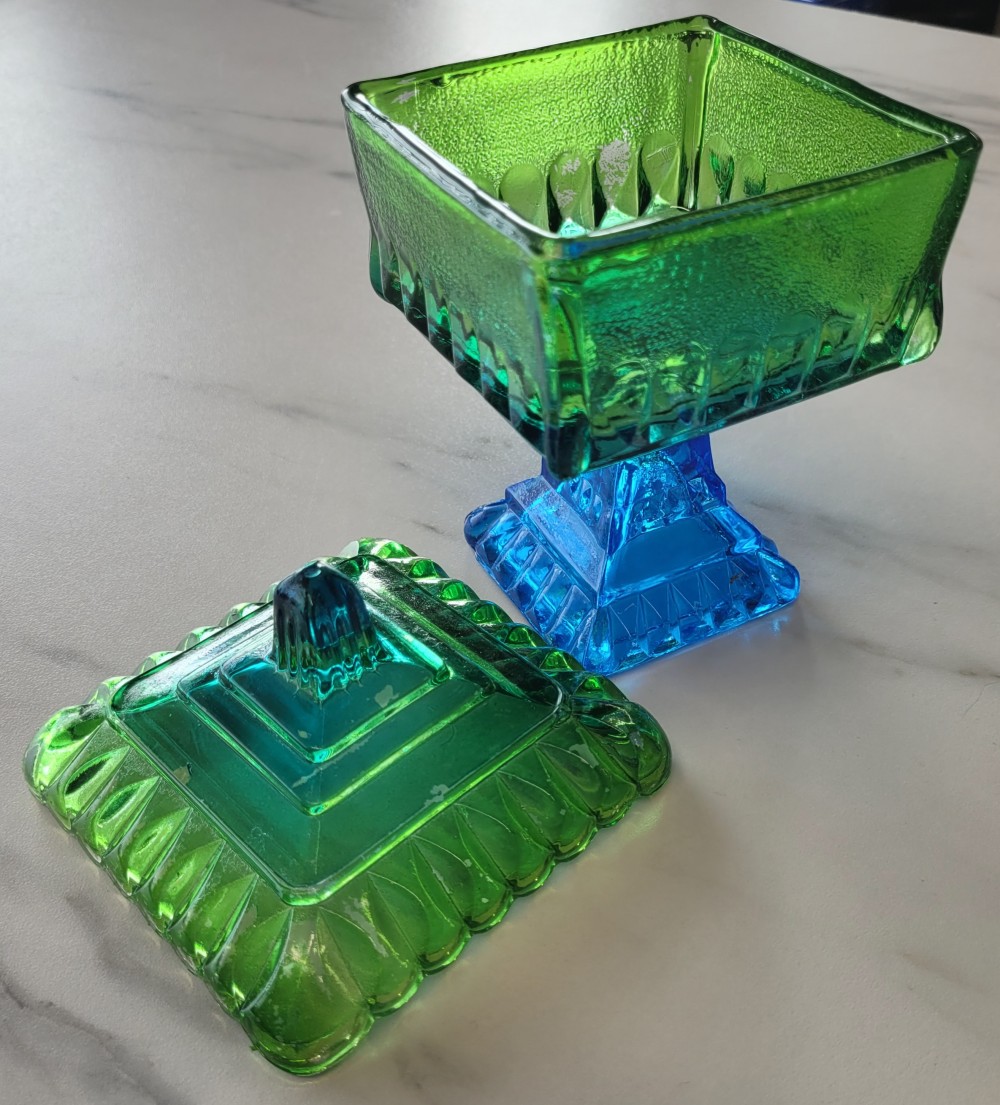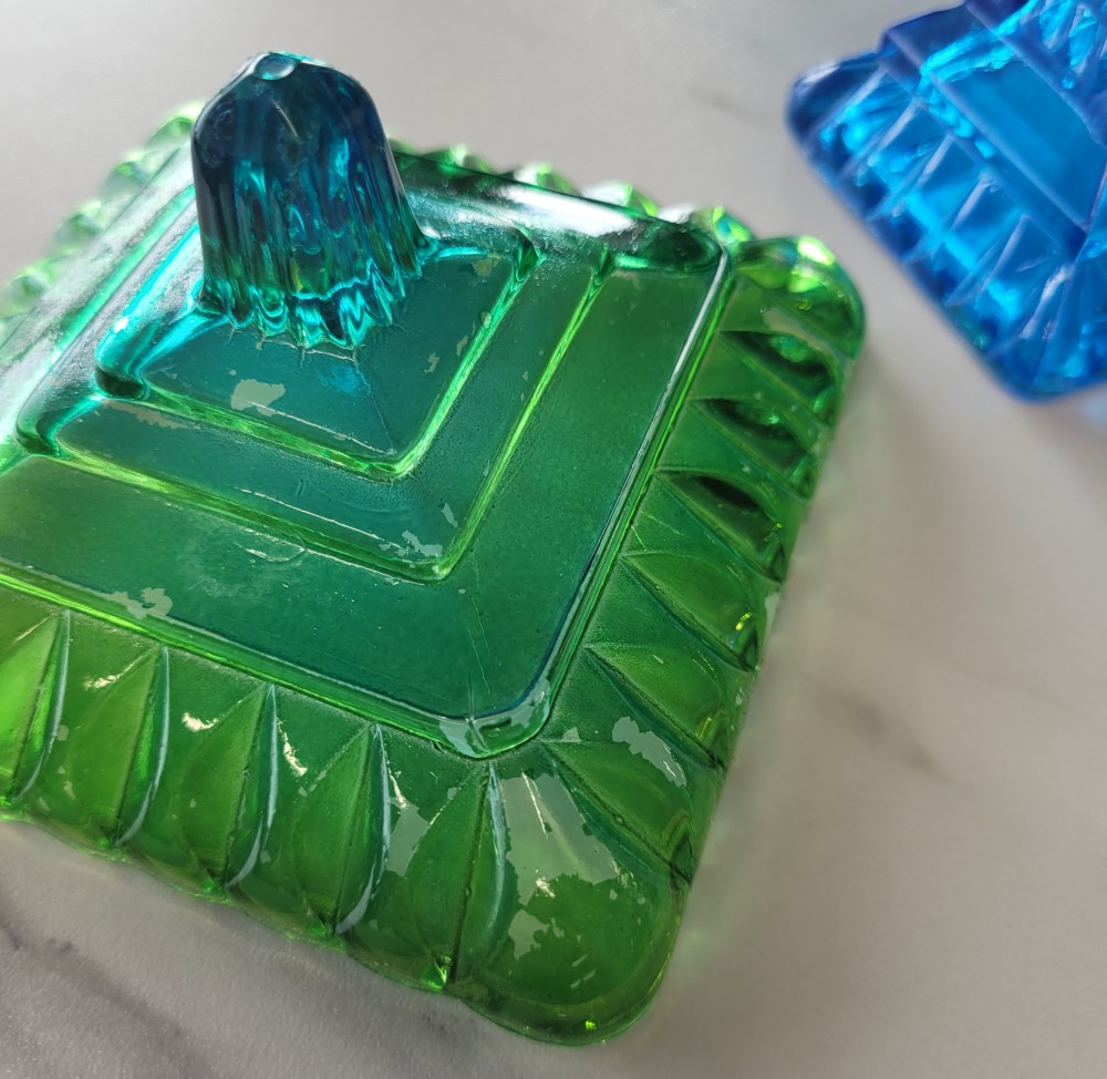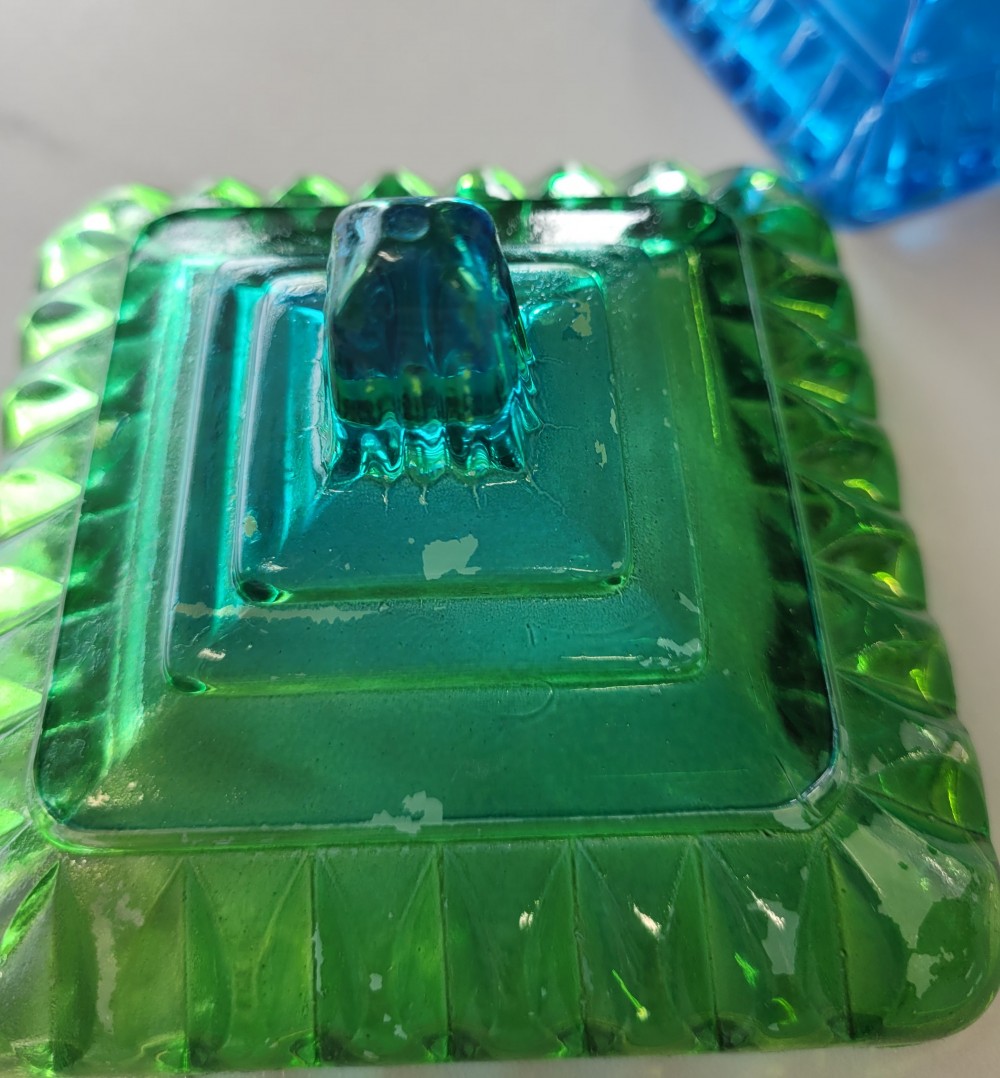 Vintage 1960s Jeanette Glass Cake Box in blue & green. Glass is structurally sound with no chips, cracks, or damage to both box and lid. Flashed color shows chips in color on both box and lid, please check puctures.