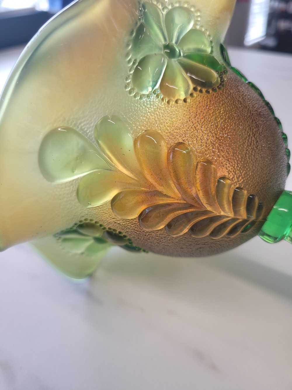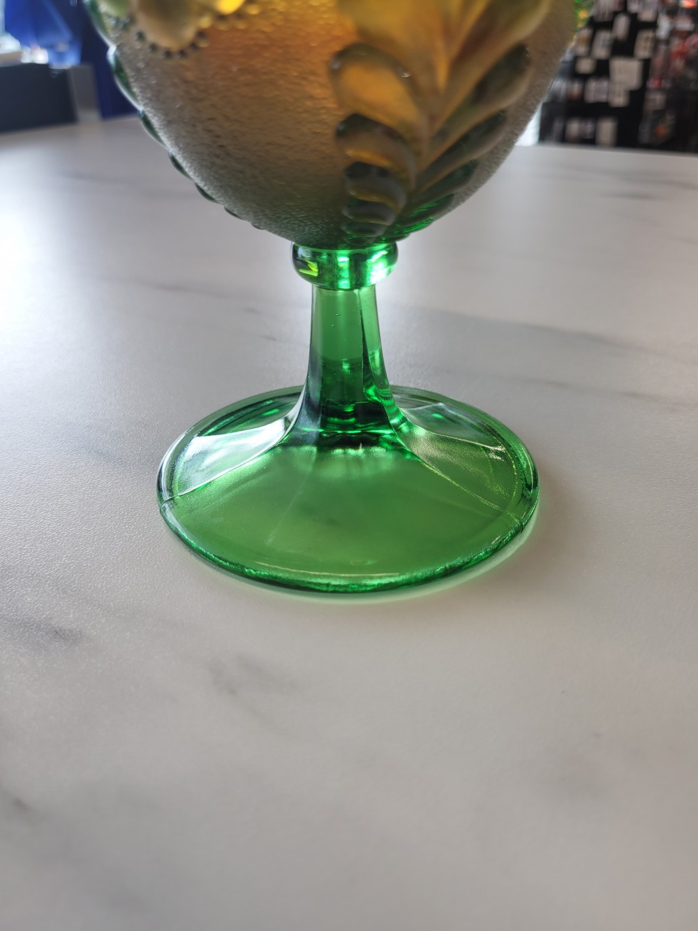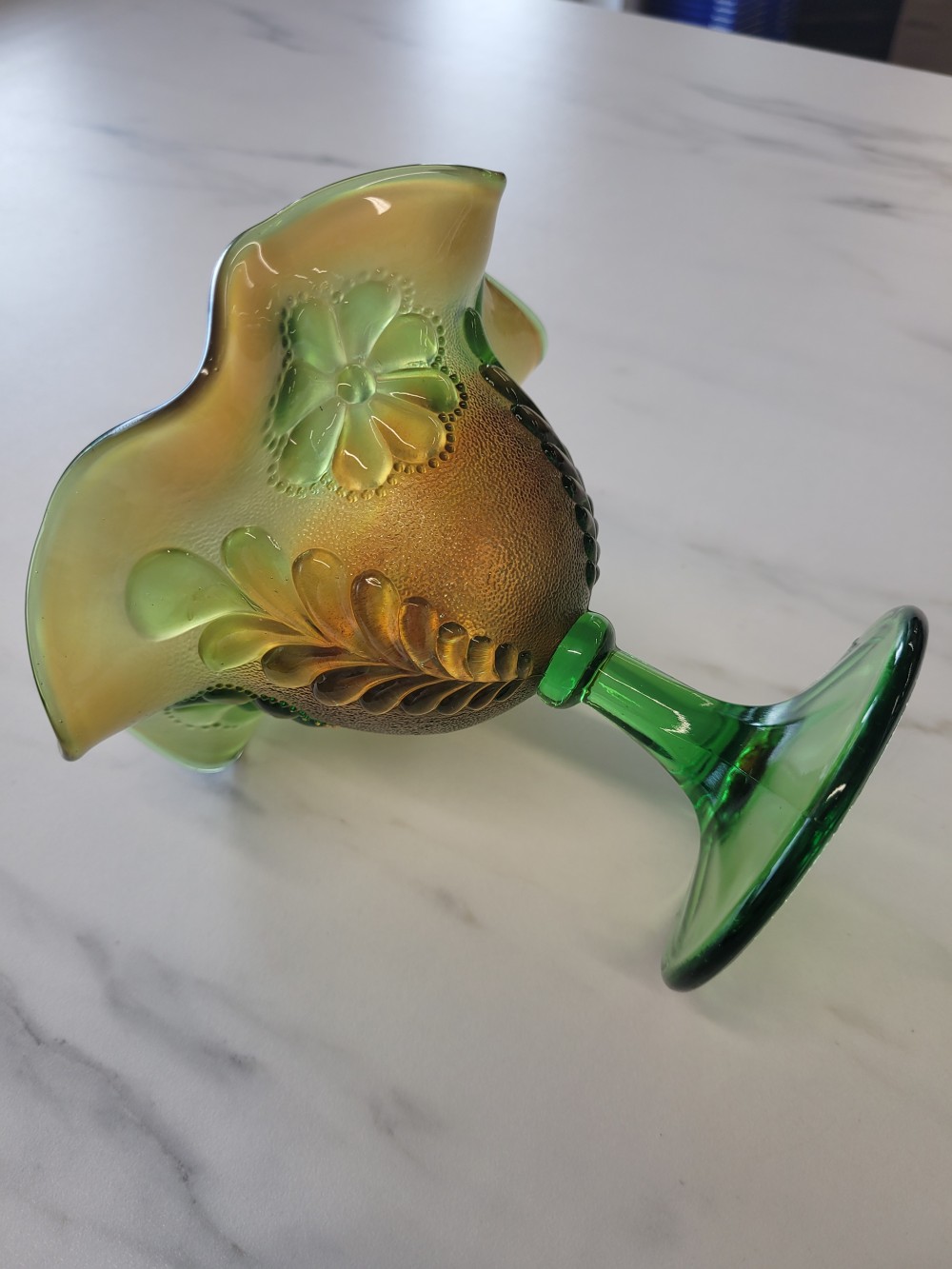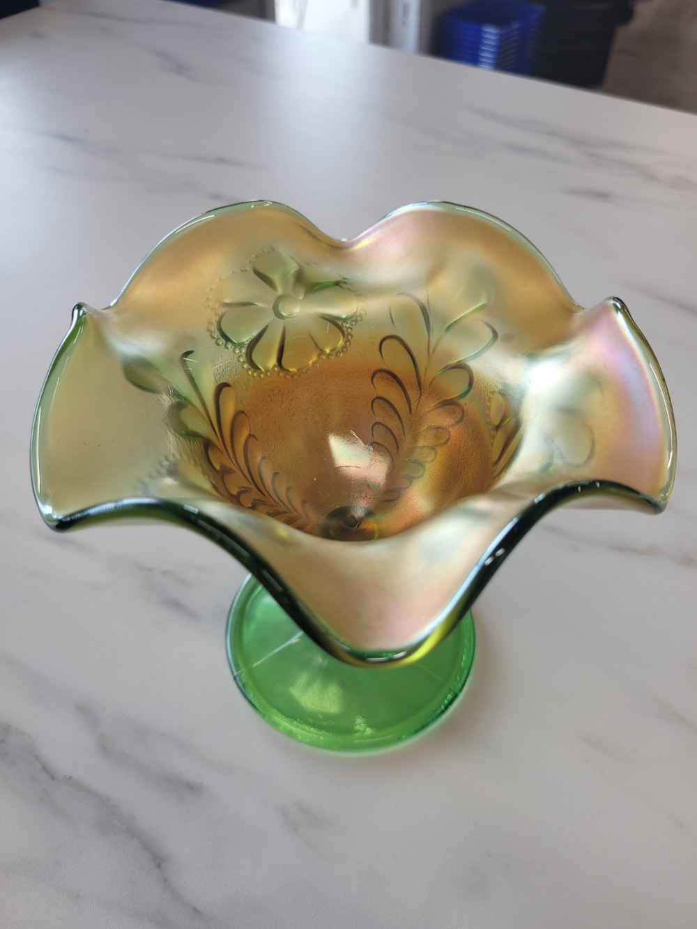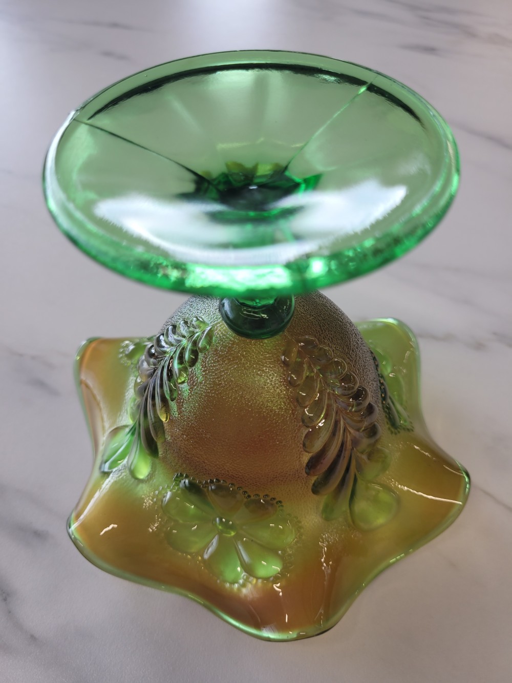 Vintage 1930s carnival glass compote dish by Northwood. Features Daisy & Scroll pattern in green glass with orange carnival finish. Approximately 5.25 in tall and 5 in across. Excellent vintage condition with minor imperfections in carnival finish. Glass is in perfect vintage condition with no chips, cracks, or damage.