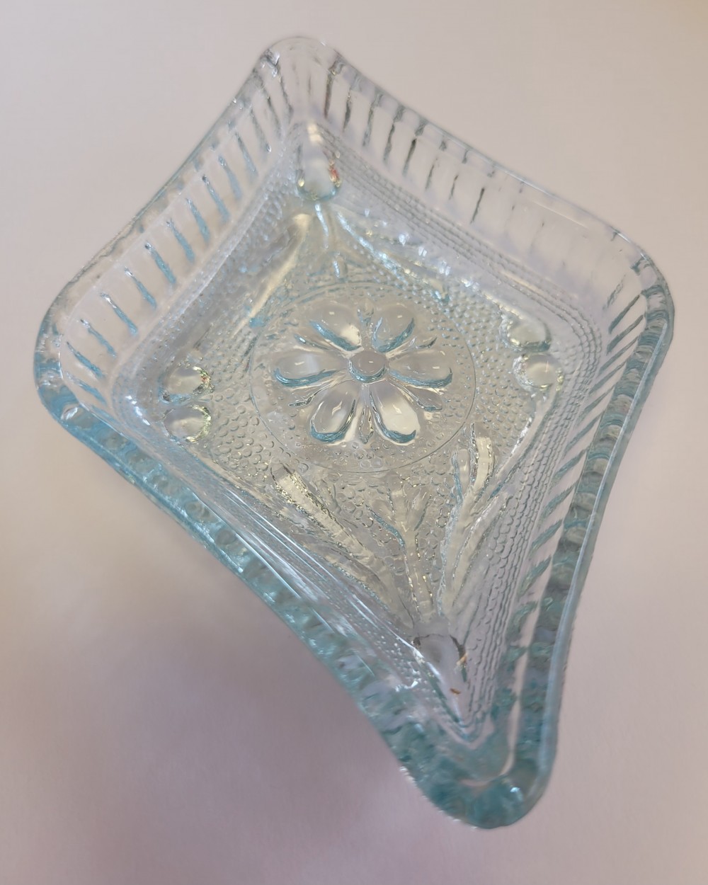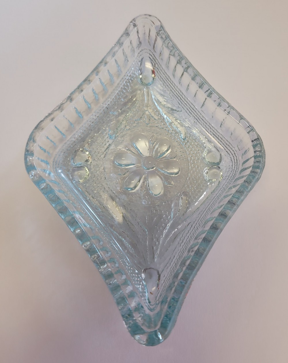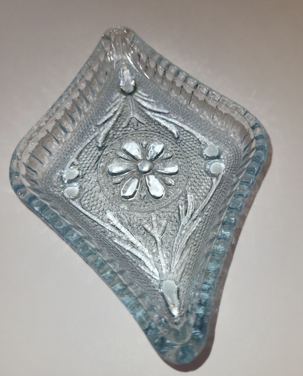 Indiana Glass vintage suit of cards tray, diamond in icy light blue. Approximately 4.75 x 3.25 inches. Excellent vintage condition.