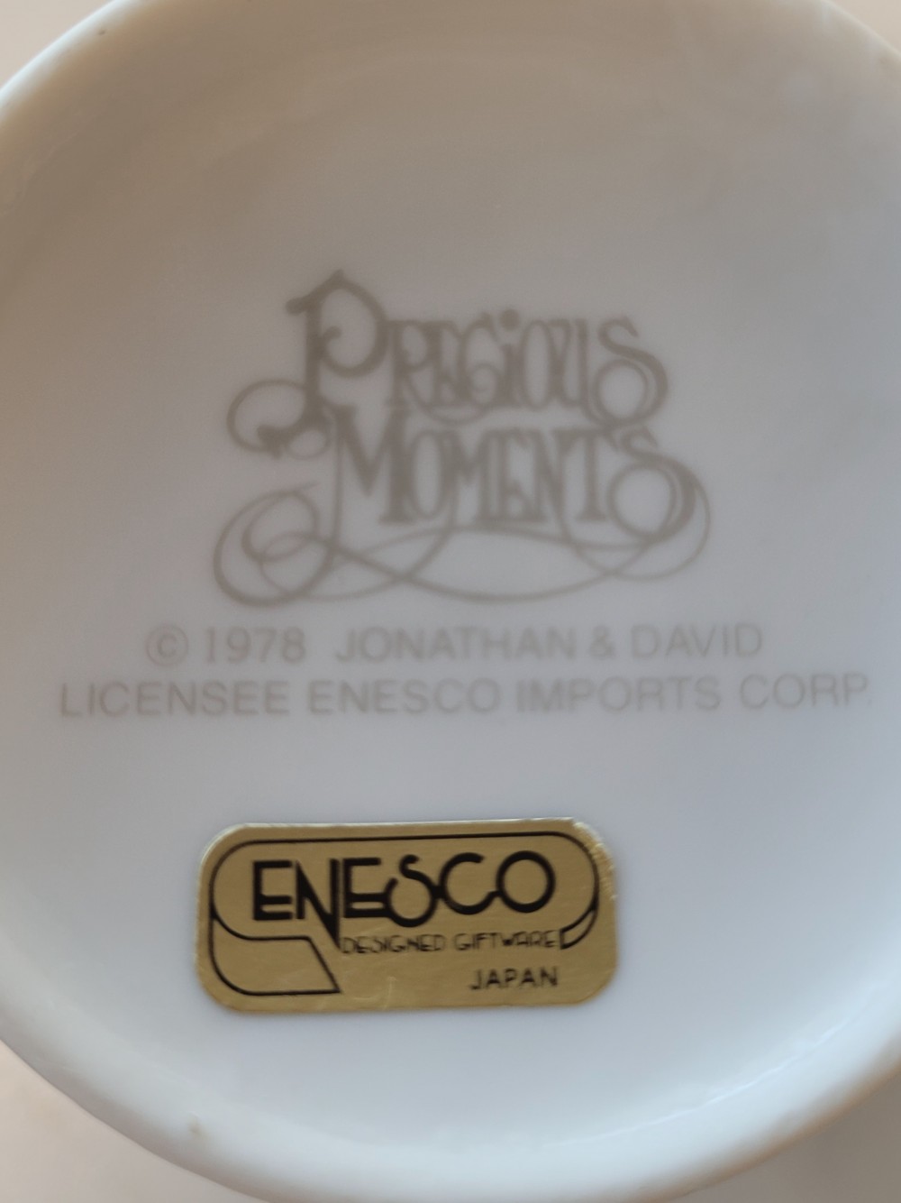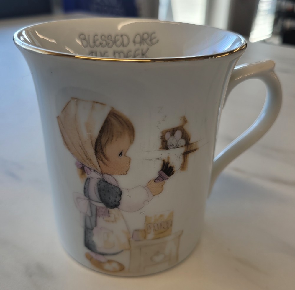 Gold rimmed Precious Moments cup by Enesco, dated 1978. Approximately 3.75 inches tall by 3.3 inches wide, width including handle- 4.25. Graphic depicts a young girl cleaning with Biblical quote, "Blessed are the meek," along rim inside cup. Cup, paint, and gold rim are all in excellent vintage condition.