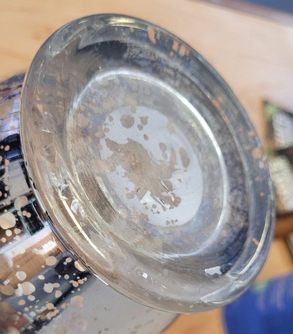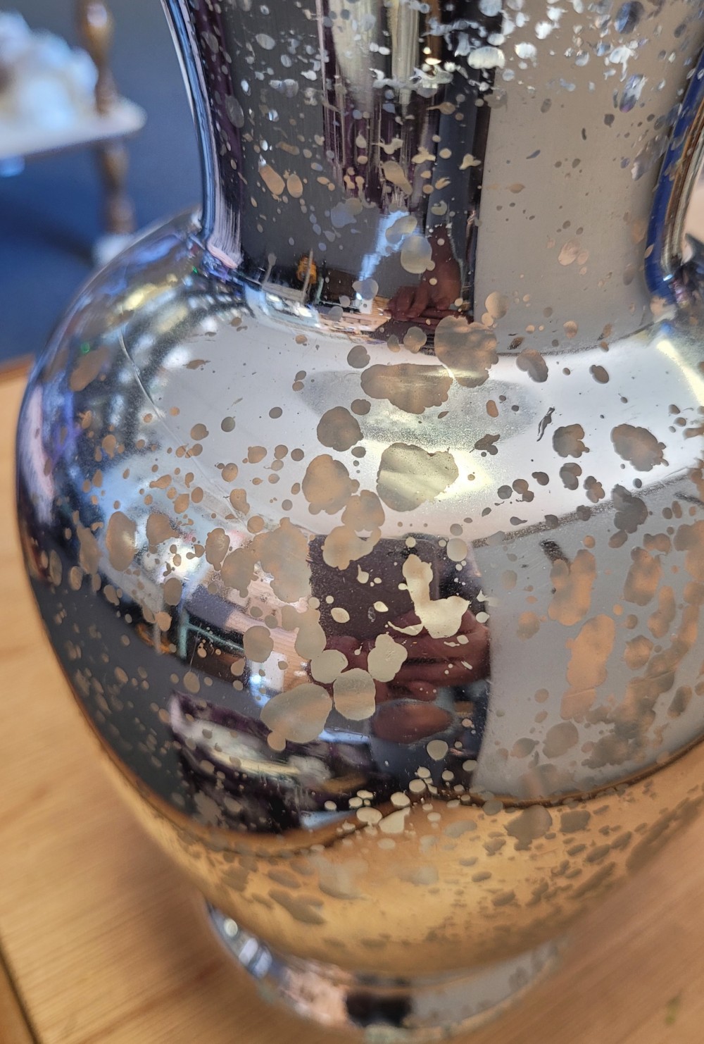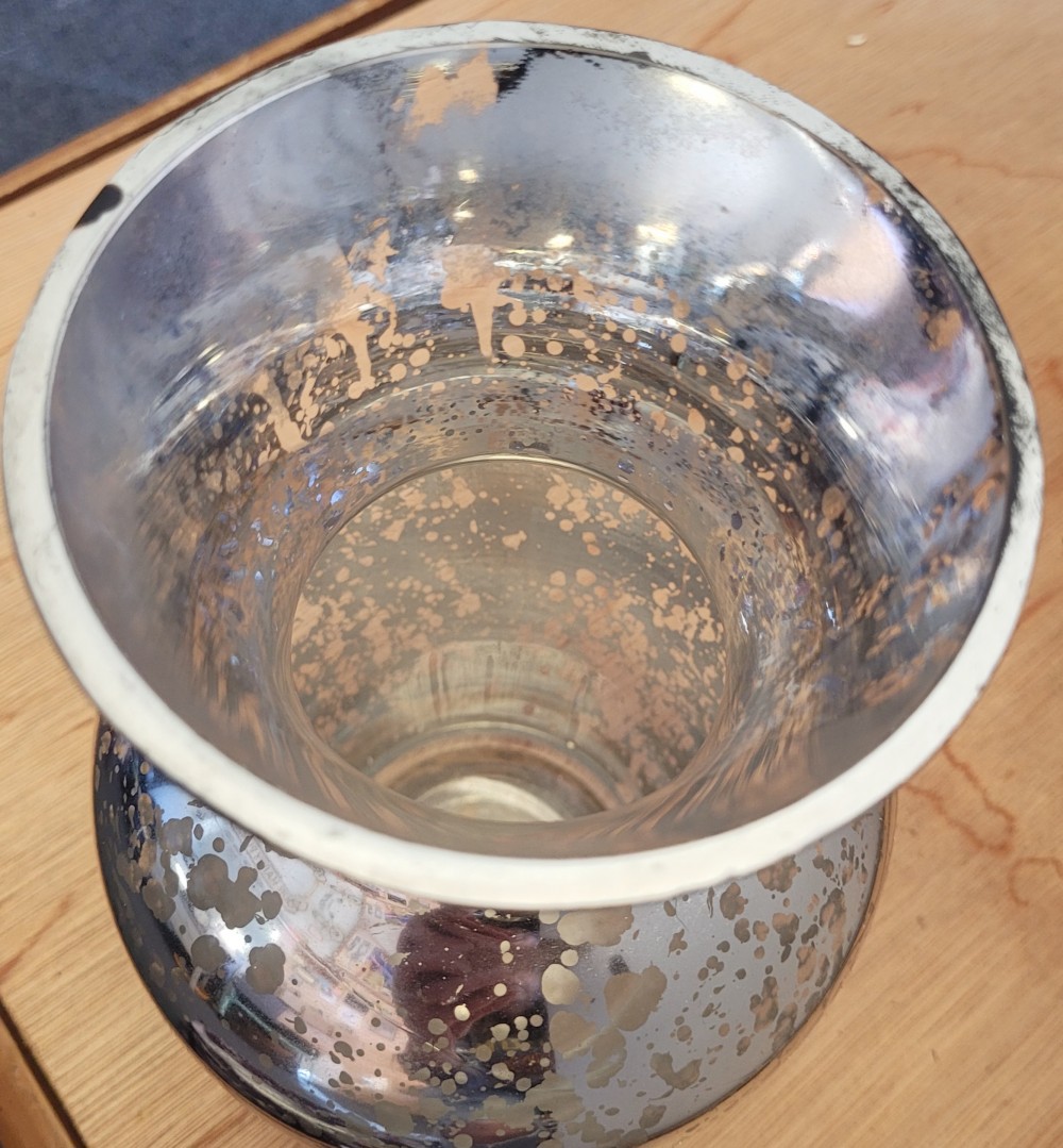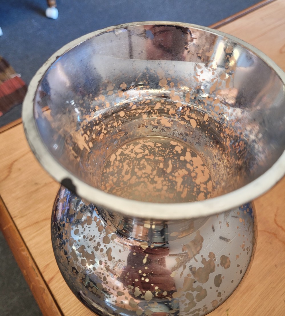 Mercury glass vase, approximately 9 inches tall by 6 inches wide. Fluted opening. Excellent sed condition, no chips, cracks, or damage.